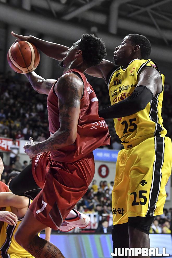 [점프볼=안양/홍기웅 기자] 6일 안양실내체육관에서 열린 '2019-2020 현대모비스 프로농구' 안양 KGC와 창원 LG의 경기. KGC 크리스 맥컬러의 더블클러치를 LG 캐디 라렌이 블록슛하고 있다.