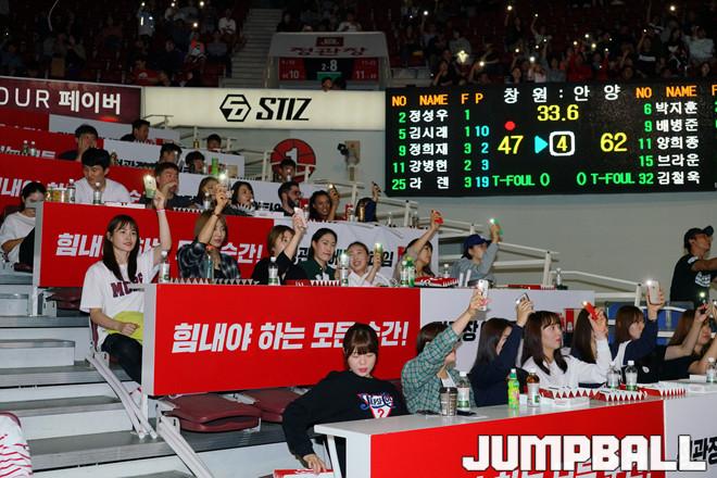 [점프볼=안양/홍기웅 기자] 6일 안양실내체육관에서 열린 '2019-2020 현대모비스 프로농구' 안양 KGC와 창원 LG의 경기. 여자프로배구 KGC 인삼공사가 농구 관람을 하면서 휴대폰 손전등으로 응원을 펼치고 있다.