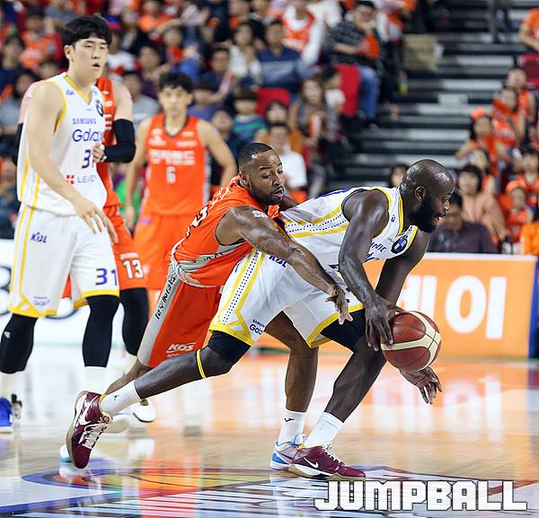 [점프볼=인천/한명석 기자] 6일 인천삼산체육관에서 열린 '2019-2020 현대모비스 프로농구' 인천전자랜드와 서울삼성과의 경기에서 인천 전자랜드 섀넌 쇼터 선수가 서울 삼성 델로이 제임스 선수의 볼을 스틸하기 위해 팔을 뻗고 있다.