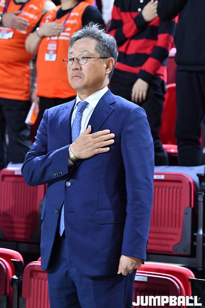 [점프볼=인천/홍기웅 기자] 8일 인천삼산체육관에서 열린 '2019-2020 현대모비스 프로농구' 인천 전자랜드와 고양 오리온의 경기. 이정대 KBL 총재가 국민의례를 하고 있다.