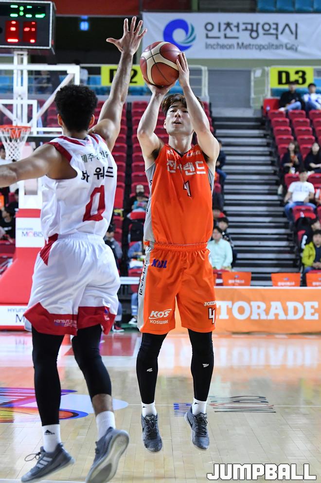 [점프볼=인천/홍기웅 기자] 8일 인천삼산체육관에서 열린 '2019-2020 현대모비스 프로농구' 인천 전자랜드와 고양 오리온의 경기. 전자랜드 김낙현이 3점슛을 던져 득점에 성공시키고 있다.