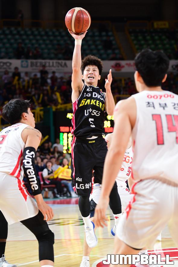 [점프볼=창원/박상혁 기자] 9일 창원실내체육관에서 열린 '2019-2020 현대모비스 프로농구' 창원 LG와 서울 SK의 경기, LG 김시래가 플로터 슛을 시도하고 있다.