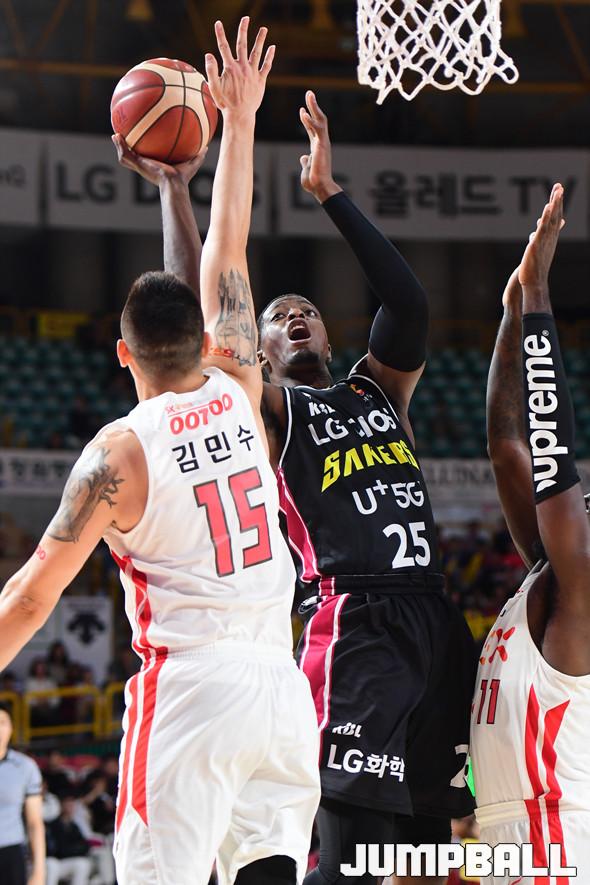 [점프볼=창원/박상혁 기자] 9일 창원실내체육관에서 열린 '2019-2020 현대모비스 프로농구' 창원 LG와 서울 SK의 경기, LG 라렌이 SK 김민수를 앞에두고 슛을 시도하고 있다.