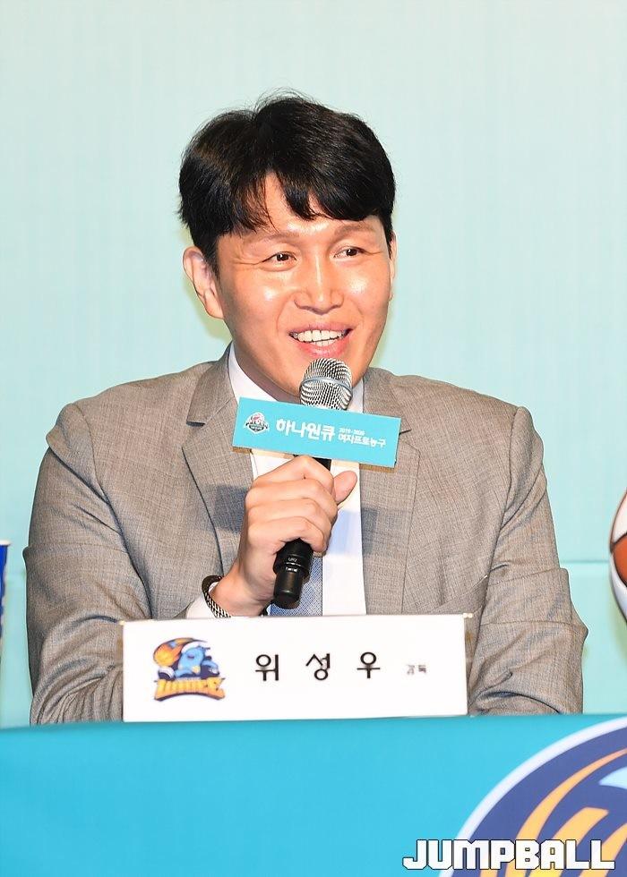 [점프볼=홍은/유용우 기자] 10일 서울 서대문구 홍은동에 위치한 그랜드힐튼호텔 그랜드볼룸에서 열린 '하나원큐 2019~2020 여자프로농구' 미디어데이, 우리은행 위성우 감독이 아나운서의 질문에 답하고 있다.