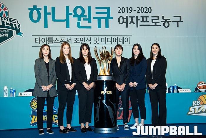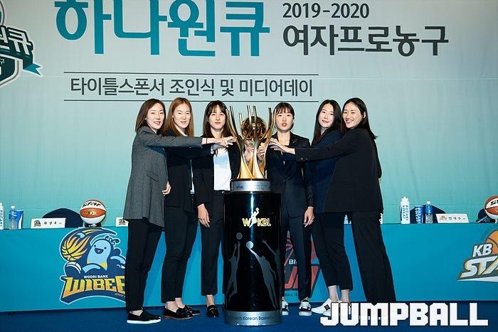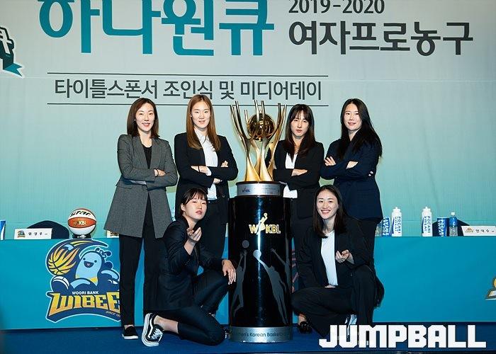 [점프볼=홍은/유용우 기자] 10일 서울 서대문구 홍은동에 위치한 그랜드힐튼호텔 그랜드볼룸에서 열린 '하나원큐 2019~2020 여자프로농구' 미디어데이, WKBL 6개구단 대표선수들이 화이팅을 하며 다가오는 시즌의 선전을 다짐하고 있다.