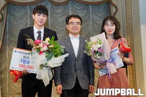 [점프볼=논현/홍기웅 기자] 11일 임페리얼펠리스 서울 7층 셀레나홀에서 열린 '2019 KUSF 대학농구 U-리그 시상식'. 정규리그 기량발전상 남자부 고려대 박민우, 여자부 용인대 이재은이 수상후 기념촬영을 하고 있다.