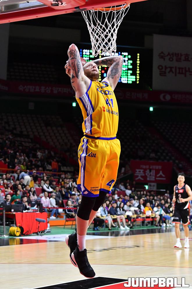 [점프볼=부산/홍기웅 기자] 12일 부산사직실내체육관에서 열린 '2019-2020 현대모비스 프로농구' 부산 KT와 서울 삼성의 경기. 삼성 닉 미네라스가 투핸드 덩크를 하기 위해 날아오르고 있다.