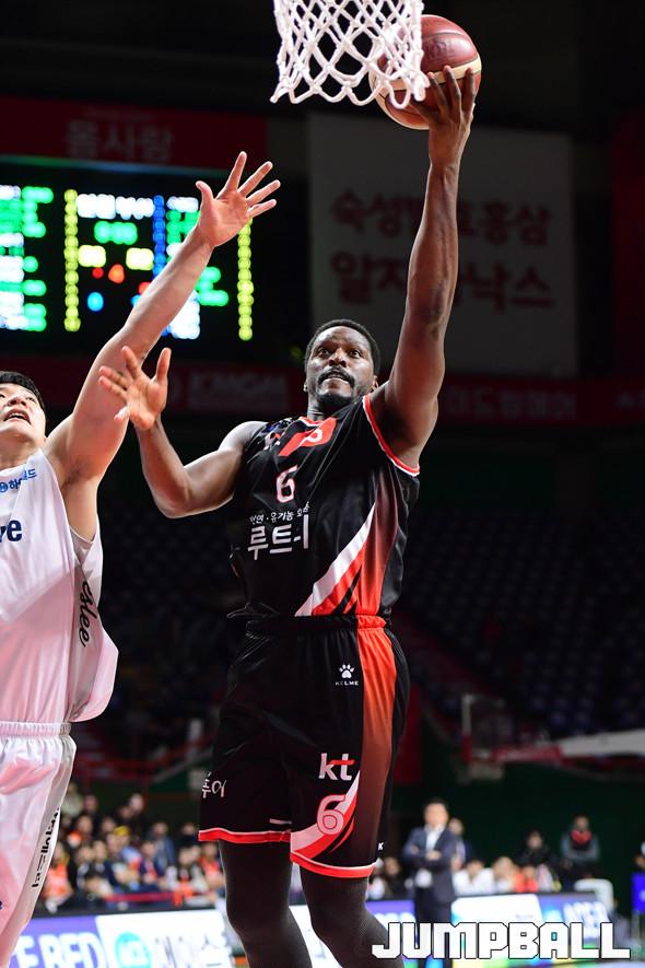 [점프볼=부산/박상혁 기자] 13일 부산사직실내체육관에서 열린 '2019-2020 현대모비스 프로농구' 부산 KT와 인천 전자랜드의 경기, KT 쏜튼이 레이업슛을 시도하고 있다.