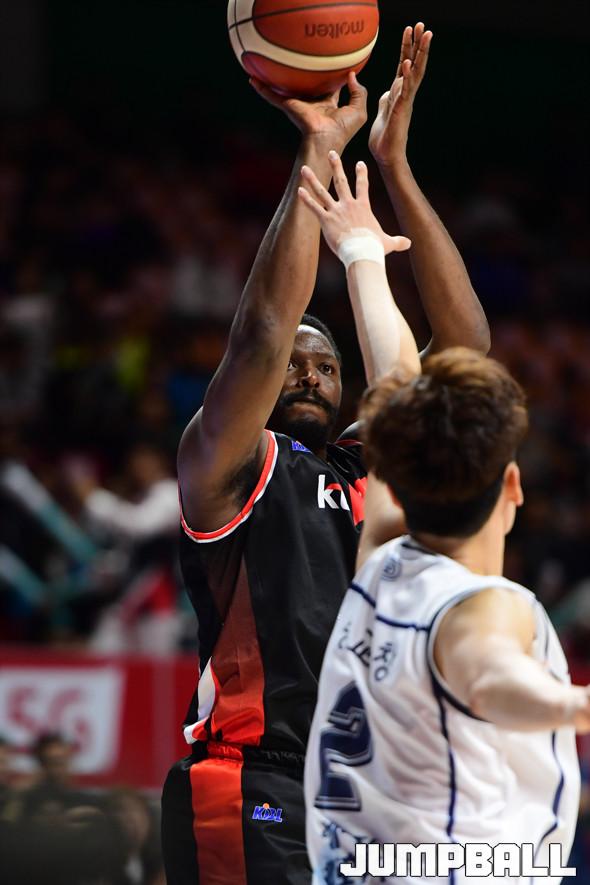 [점프볼=부산/박상혁 기자] 17일 부산사직실내체육관에서 열린 '2019-2020 현대모비스 프로농구' 부산 KT와 전주 KCC의 경기, KT 쏜튼이 슛을 시도하고 있다.
