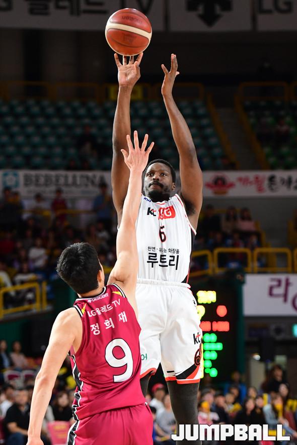 [점프볼=창원/박상혁 기자] 19일 창원실내체육관에서 열린 '2019-2020 현대모비스 프로농구' 창원 LG와 부산 KT의 경기, KT 쏜튼이 슛을 시도하고 있다.