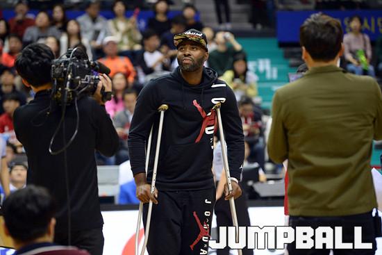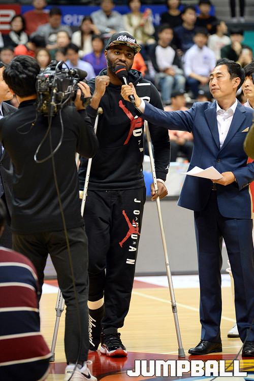 19일 고양종합체육관에서 열린 '2019~2020 현대모비스 프로농구' 고양 오리온 과 서울 SK 의 경기, 지난 10일 부산 KT와의 홈경기에서 아킬레스건 완전 파열 부상을 당해 귀국을 결정한 마커스 랜드리가 오리온 선수단, 그리고 고양 팬들과 작별 인사를 하고있다.