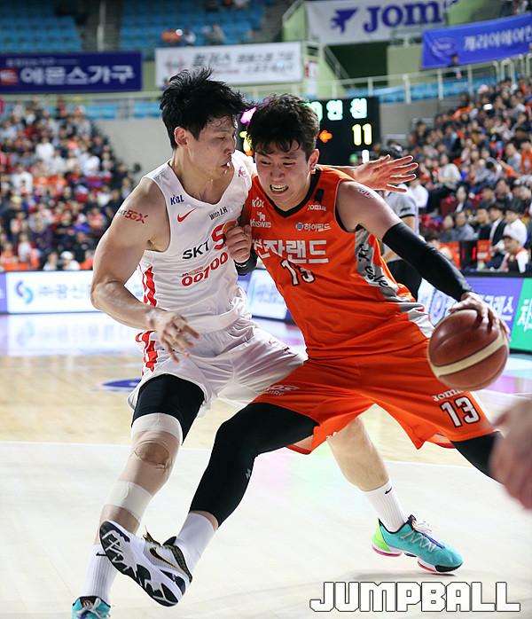 [점프볼=인천/한명석 기자] 20일 인천삼산체육관에서 열린 '2019-2020 현대모비스 프로농구' 인천전자랜드와 서울SK와의 경기에서 인천 전자랜드 강상재 선수가 강력한 수비를 뚫기 위해 노력하고 있다.