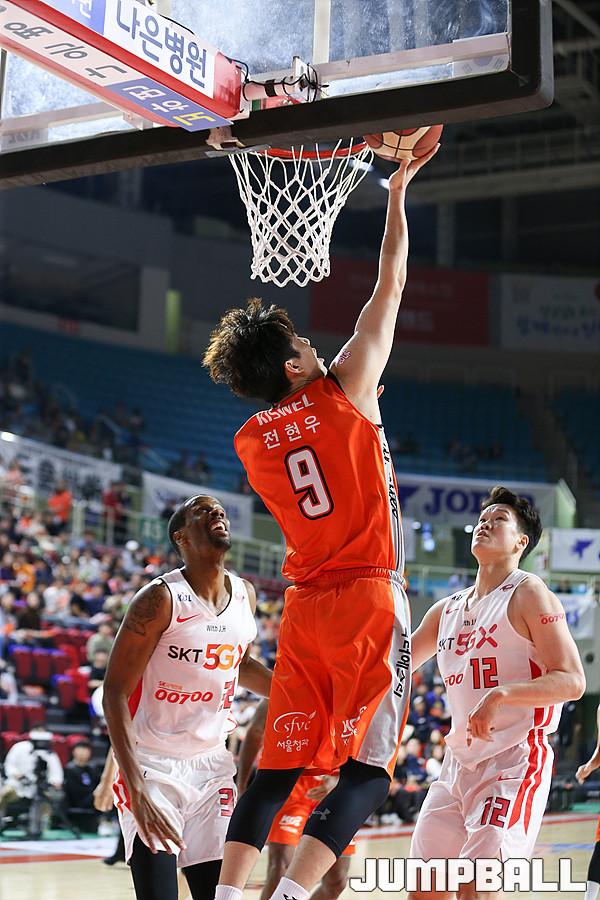 [점프볼=인천/한명석 기자] 20일 인천삼산체육관에서 열린 '2019-2020 현대모비스 프로농구' 인천전자랜드와 서울SK와의 경기에서 인천 전자랜드 전현우가 리버스 레이업 슛으로 마무리 하고 있다.