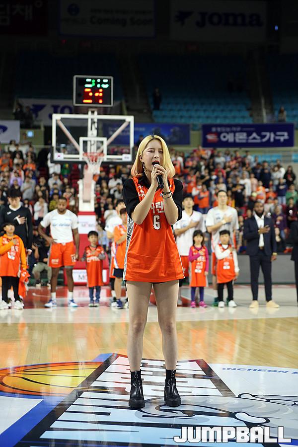 [점프볼=인천/한명석 기자] 20일 인천삼산체육관에서 열린 '2019-2020 현대모비스 프로농구' 인천전자랜드와 서울SK와의 경기에서 아이돌 그룹 '미드나잇'의 멤버들이 애국가와 시투를 시도하고 있다.