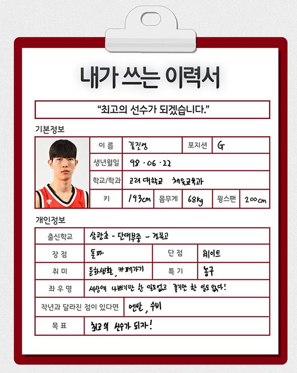 [점프볼=강현지 기자] 2019 KBL 국내신인선수 드래프트에 나오는 예비 프로들이 쓰는 취업이력서. 스물 한 번째 주인공은 장신 가드 유망주, 고려대 김진영(G, 193cm)이다. 한국농구의 황금기였던 농구대잔치 세대에서 기아자동차 천하를 이끌었고, 현재는 SPOTV 해설위원으로 활동 중인 김유택 전 감독(중앙대)이 그의 아버지. 실루엣까지도 닮은 부자지만, 포지션만큼은 다르다. 신장에다 스피드까지 갖춰 앞선과 골밑까지도 커버가 가능한 것이 그의 장점. “최고의 선수가 되고 싶다”라고 외치며 남들보다 1년 일찍 프로무대에 나서는 김진영의 각오를 들어봤다.