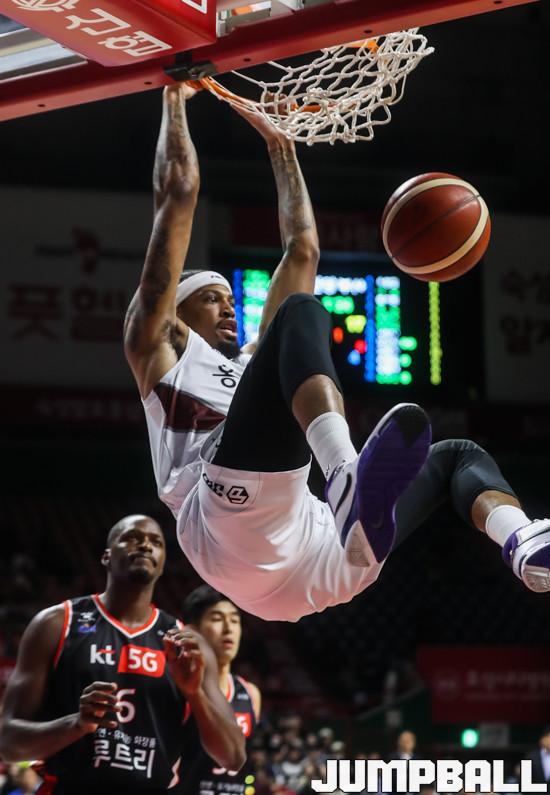 26일 부산 사직실내체육관에서 열린 '2019-2020 현대모비스 프로농구' 부산 kt 경기와 안양 KGC 경기에서 KGC 맥컬러가 덩크슛을 하고 있다.
