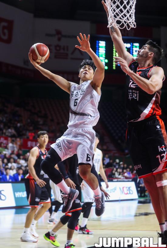 26일 부산 사직실내체육관에서 열린 '2019-2020 현대모비스 프로농구' 부산 kt 경기와 안양 KGC 경기에서 KGC 박지훈이 kt 멀린스의 수비를 피해 레이업 슛을 하고 있다.