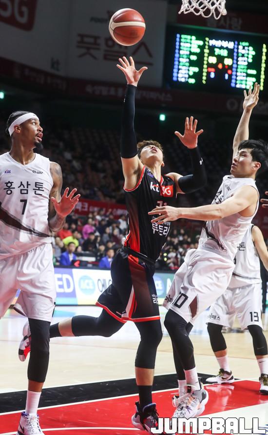 26일 부산 사직실내체육관에서 열린 '2019-2020 현대모비스 프로농구' 부산 kt 경기와 안양 KGC 경기에서 kt 양홍석이 KGC 문성곤의 수비를 피해 슛을 하고 있다.