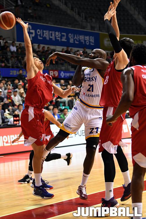 27일 고양종합체육관에서 열린 '2019~2020 현대모비스 프로농구' 고양 오리온 과 서울 삼성 의 경기, 수비에 가로막힌 삼성 델로이 제임스가 사이드로 패스를 하고있다.