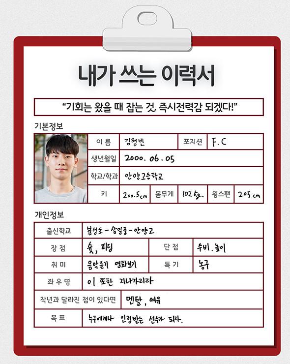 [점프볼=강현지 기자] 2019 KBL 국내신인선수 드래프트에 나오는 예비 프로들이 쓰는 취업이력서. 스물 두 번째 주인공은 센터 포지션에서 ‘고졸 루키’를 예약한 김형빈(20, 200cm). 장신 유망주로서 스포트라이트를 받았던 그가 덜컥 프로 조기진출을 결정한 이유는 뭘까. 농구공을 잡은 지 4년만에 청소년대표를 거쳐 프로 무대 도전 앞에 선 그는 더 큰 무대에서의 성장을 다짐했다.