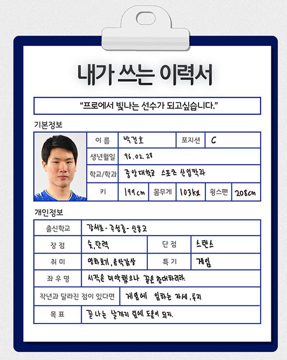 [점프볼=강현지 기자] 2019 KBL 국내신인선수 드래프트에 나오는 예비 프로들이 쓰는 취업이력서. 스물 세 번째 주인공은 대학 생활의 아쉬움을 뒤로 하고, 프로에서 가능성을 펼쳐보이겠다며 당찬 각오를 외친 중앙대 박건호(C, 198.8cm)다. 동기들보다는 많은 시간 코트에 서지는 못했지만, 프로라는 꿈 하나를 놓지 않고 묵묵히 달려온 박건호. 한 경기를 뛰기 위해 운동을 해왔다며 간절함을 내비친 그의 이야기를 들어보자.