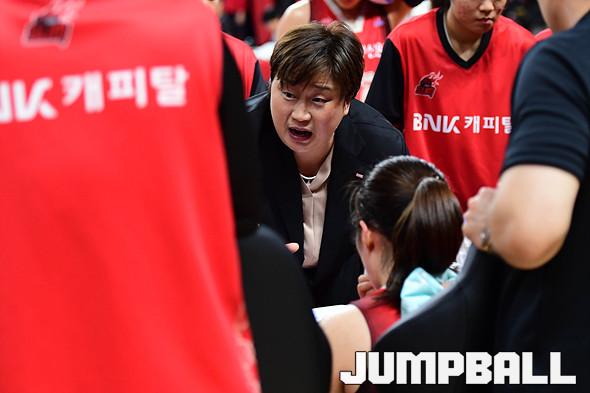 [점프볼=부산/박상혁 기자] 31일 부산스포원파크 BNK센터에서 열린 '하나원큐 2019-2020 여자프로농구' 부산 BNK와 용인 삼성생명의 경기, BNK 유영주 감독이 선수들에게 작전 지시를 내리고 있다.