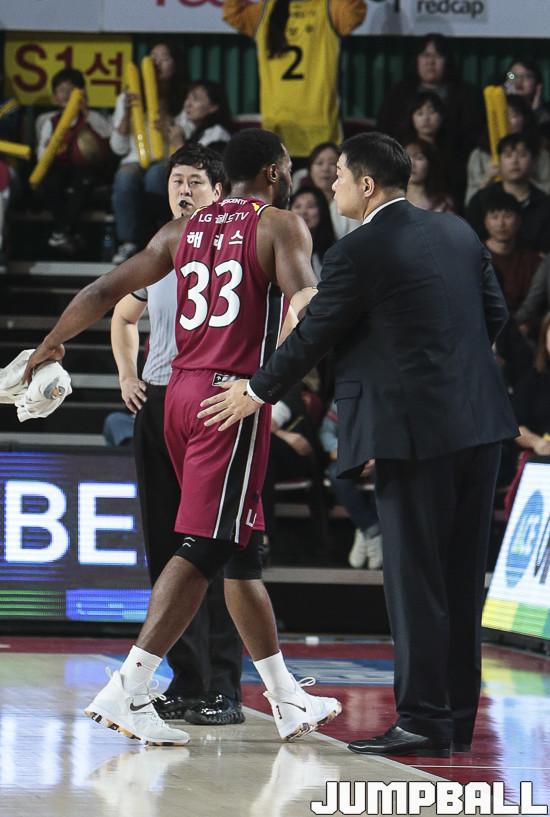 2일 창원실내체육관에서 열린 '2019-2020 현대모비스 프로농구' 창원 LG와 안양 KGC의 경기에서 KGC LG 현주엽 감독이 교체되어 벤치로 들어오는 해리스를 격려하고 있다.