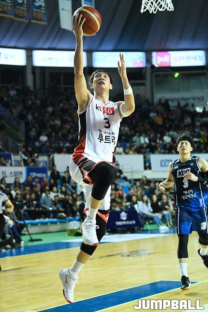 [점프볼=전주/유용우 기자] 03일 전주실내체육관에서 열린 '2019~2020 현대모비스 프로농구' 전주 KCC와 부산 kt의 경기, kt 한희원이 스틸에 이어 득점을 올리고 있다.