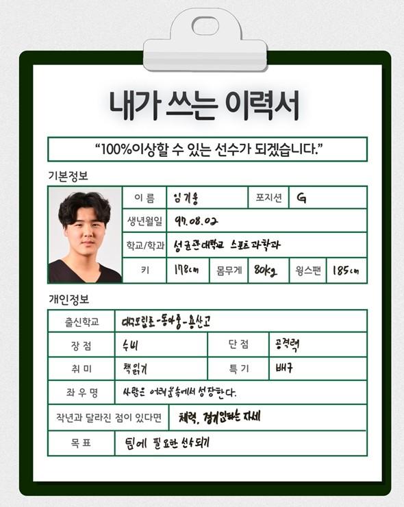[점프볼=강현지 기자] 2019 KBL 국내신인선수 드래프트에 나오는 예비 프로들이 쓰는 취업이력서. 스물 여섯 번째 주인공은 성균관대 캡틴 임기웅(G, 176.5cm)이다. 팀원들이 흔들릴 때마다 코트에 안정감을 불어넣어왔던 든든한 주장 임기웅은 꿈의 무대를 향해 어떤 출사표를 던졌을까.