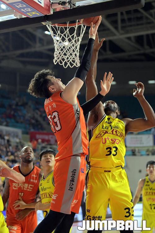 03일 인천삼산체육관에서 열린 '2019~2020 현대모비스 프로농구' 인천 전자랜드 와 창원 LG 의 경기, 전자랜드 강상재가 LG 해리스의 수비를 피해 리버스 레이업슛을 시도하고있다.