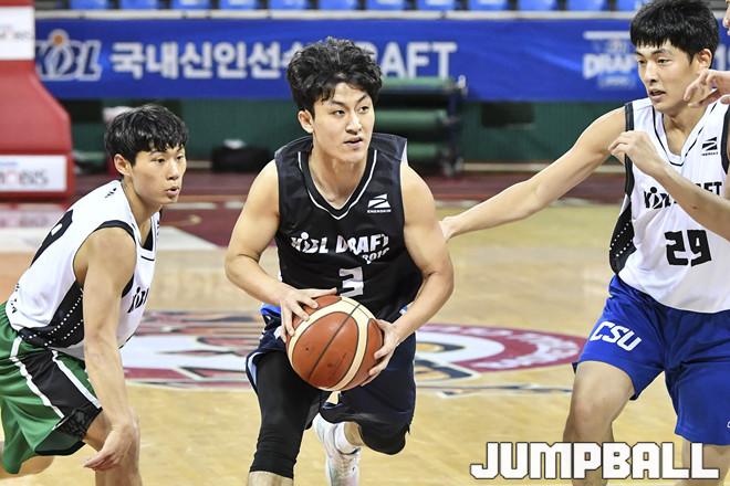 [점프볼=잠실학생체/홍기웅 기자] 4일 서울 잠실학생체육관에서 '2019 KBL 국내신인선수 드래프트' 트라이아웃이 열렸다. 전성환이 두명의 수비를 제치고 골밑으로 파고 있다.