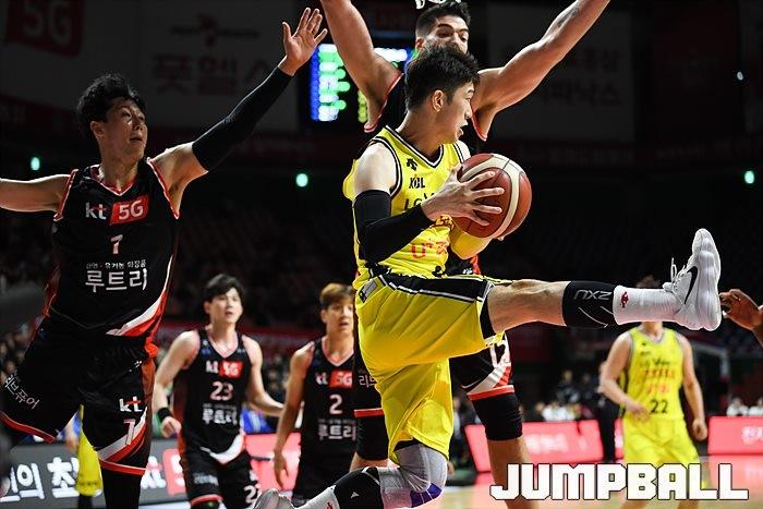 [점프볼=부산/유용우 기자] 06일 부산 사직체육관에서 열린 '2019-2020 현대모비스 프로농구' 부산 kt와 창원 LG의 경기, LG 박병우가 돌파하며 패스를 내주고 있다.