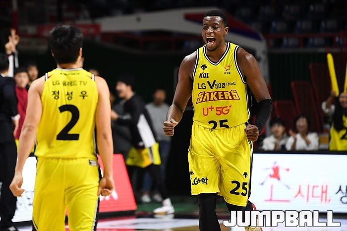 [점프볼=부산/유용우 기자] 06일 부산 사직체육관에서 열린 '2019-2020 현대모비스 프로농구' 부산 kt와 창원 LG의 경기, LG 라렌이 공격을 성공하고 포효하고 있다.