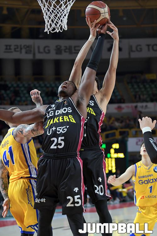 08일 창원실내체육관에서 열린 '2019~2020 현대모비스 프로농구' 창원 LG 와 서울 삼성 의 경기, LG 라렌이 같은 팀 김동량과 리바운드를 잡고있다.