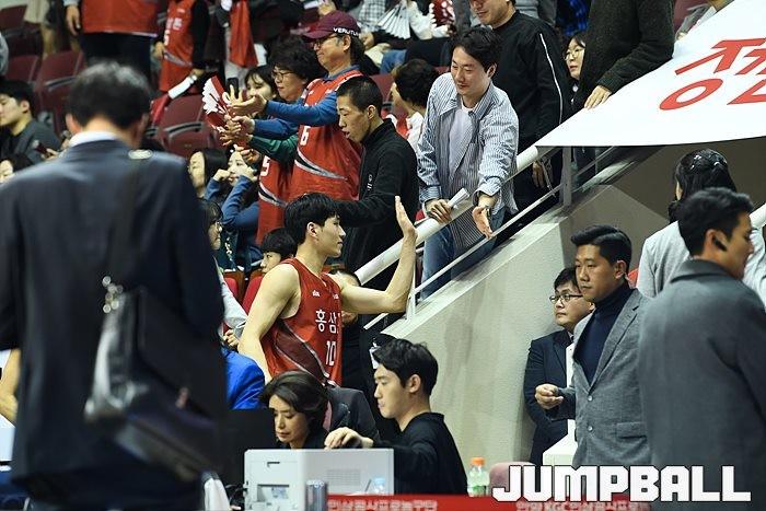 [점프볼=안양/유용우 기자] 10일 안양 실내체육관에서 열린 '2019-2020 현대모비스 프로농구' 안양 KGC 인삼공사와 고양 오리온의 경기, KGC 문성곤이 경기를 승리하고 락커룸으로 들어가며 팬과 하이파이브를 하고 있다.