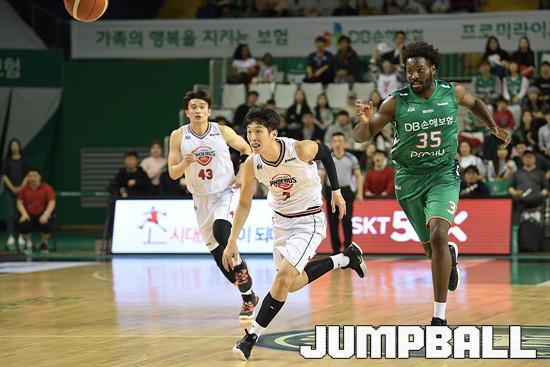 10일 원주 실내체육관에서 열린 '2019~2020 현대모비스 프로농구' 원주 DB 와 울산 모비스 의 경기, 모비스 김수찬과 DB 오누아쿠가 루즈볼을 잡기위해 달려나가고있다.