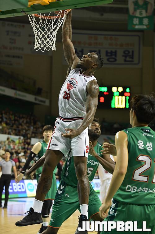 10일 원주 실내체육관에서 열린 '2019~2020 현대모비스 프로농구' 원주 DB 와 울산 모비스 의 경기, 모비스 라건아가 리바운드 공을 잡아 제자리에서 덩크슛을 성공시키고있다.