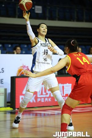 14일 뉴질랜드 오클랜드 트러스트 아레나에서 열린 2020 도쿄 올림픽 지역예선 한국과 중국의 경기, 한국 대표팀의 강아정이 3점포를 터트리자 벤치에 있던 선수들이 환호를 지르고 있다.