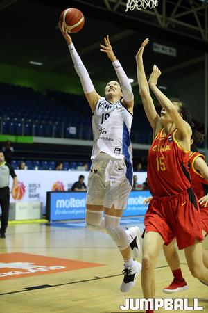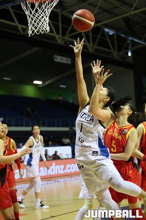 14일 뉴질랜드 오클랜드 트러스트 아레나에서 열린 2020 도쿄 올림픽 지역예선 한국과 중국의 경기, 한국 대표팀의 김정은을 비롯한 선수들이 잠시 경기가 중단 된 틈을 타 작전에 대해 이야기를 하고 있다.