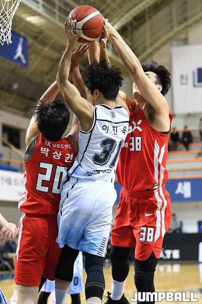 [점프볼=신촌/유용우 기자] 28일 신촌 연세대체육관에서 열린 '2019-2020 KBL D-리그' 서울 SK와 전주 KCC의 경기, KCC 이진욱이 리바운드를 경합하고 있다.