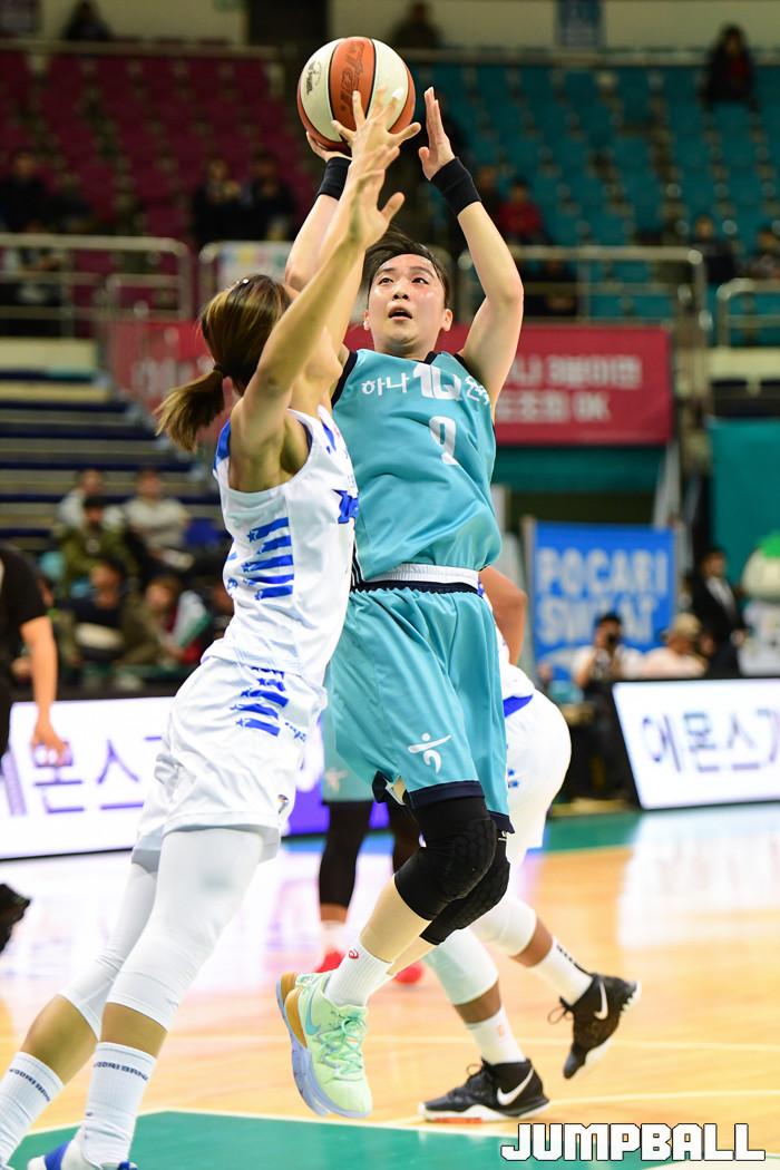 [점프볼=부천/박상혁 기자] 28일 부천실내체육관에서 열린 '하나원큐 2019-2020 여자프로농구' 부천 KEB하나은행과 아산 우리은행 위비의 경기, KEB하나은행 백지은이 슛을 시도하고 있다.