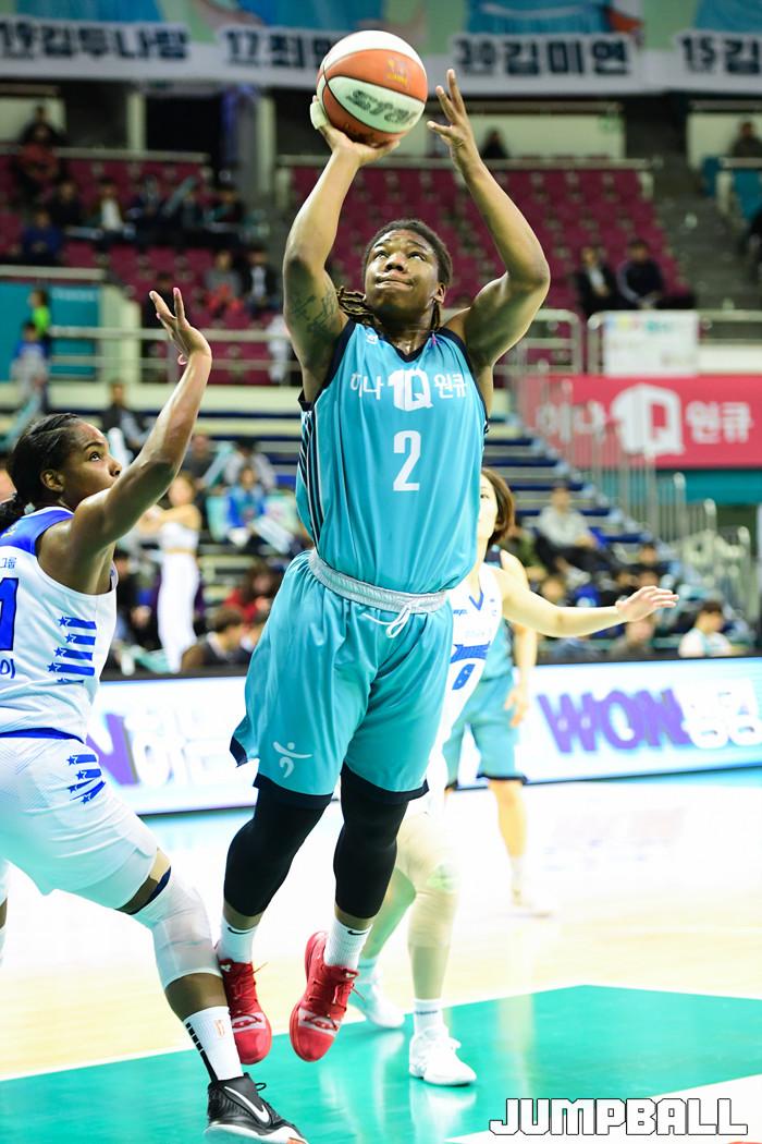 [점프볼=부천/박상혁 기자] 28일 부천실내체육관에서 열린 '하나원큐 2019-2020 여자프로농구' 부천 KEB하나은행과 아산 우리은행 위비의 경기, KEB하나은행 마이샤가 골밑슛을 시도하고 있다.