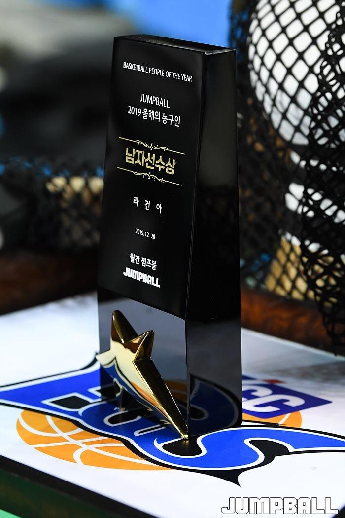 [점프볼=전주/유용우 기자] 14일, 전주실내체육관에서 열린 전주 KCC와 서울 삼성의 프로농구 3라운드 경기에 앞서 점프볼 수여하는 '올해의 농구인' 남자선수부문 시상이 개최됐다. '올해의 농구인'은 한 해 한국 농구계를 빛낸 선수에게 수여되며 대한민국농구협회 관계자 및 대학농구 감독, 미디어 등이 투표에 참가했다. 2019년 남자선수 수상자는 라건아(KCC)로, 시상은 점프볼 권부원 편집인이 맡았다.
