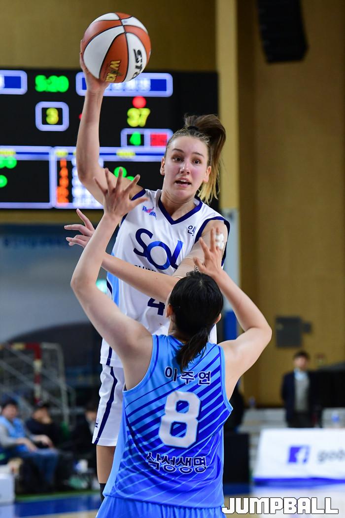 [점프볼=용인/박상혁 기자] 19일 용인실내체육관에서 열린 '하나원큐 2019-2020 여자프로농구' 용인 삼성생명과 인천 신한은행의 경기, 신한은행 엘레나 스미스가 인사이드로 패스를 시도하고 있다.