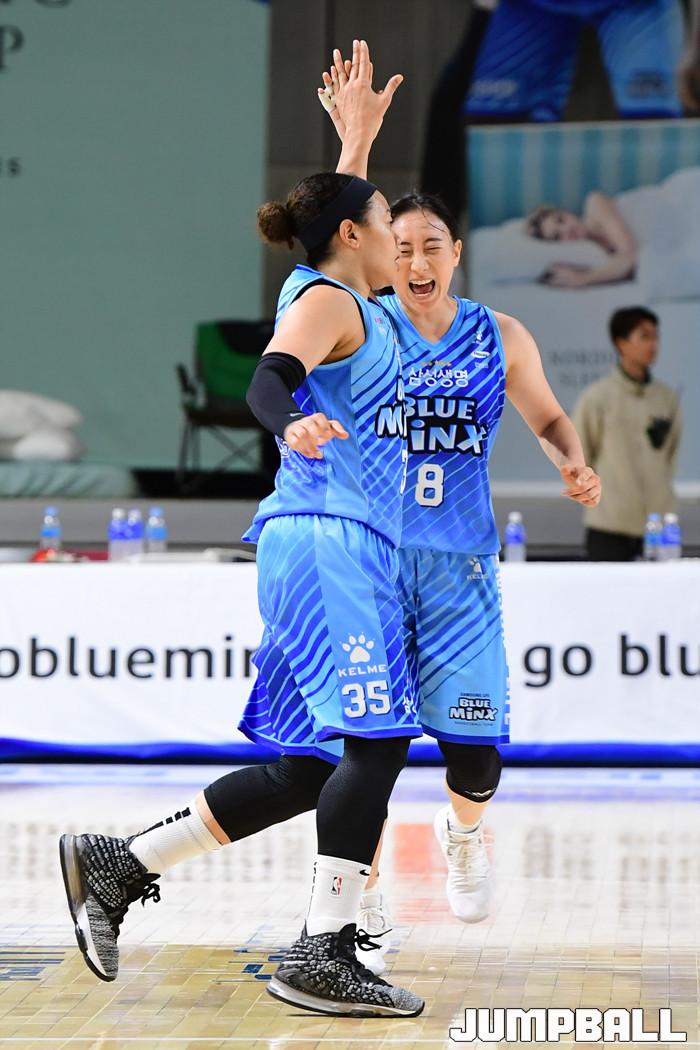 [점프볼=용인/박상혁 기자] 19일 용인실내체육관에서 열린 '하나원큐 2019-2020 여자프로농구' 용인 삼성생명과 인천 신한은행의 경기, 삼성생명 김한별이 득점을 성공시킨후 이주연과 하이파이브를 하고 있다.