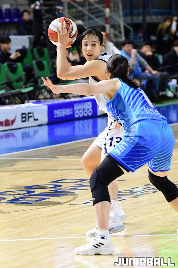 [점프볼=용인/박상혁 기자] 19일 용인실내체육관에서 열린 '하나원큐 2019-2020 여자프로농구' 용인 삼성생명과 인천 신한은행의 경기, 신한은행 김단비가 패스를 받아줄 동료를 찾고 있다.