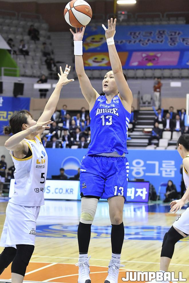 [점프볼=아산/홍기웅 기자] 6일 아산 이순신체육관에서 열린 '하나원큐 2019-2020 여자프로농구' 아산 우리은행과 청주 KB의 경기. 우리은행 김정은이 점프슛을 던지고 있다.