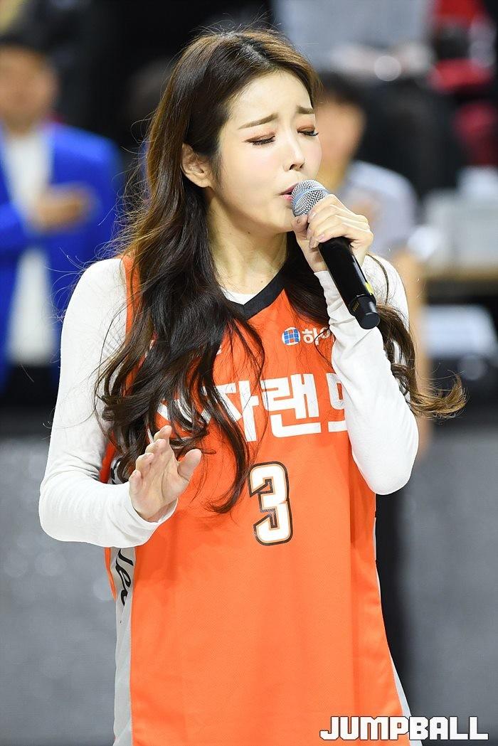 [점프볼=인천/유용우 기자] 10일 인천 삼산체육관에서 열린 '2019-2020 현대모비스 프로농구' 인천 전자랜드와 원주 DB의 경기, 미스트롯 출신 트로트 가수 박성연이 애국가를 부르고 있다.