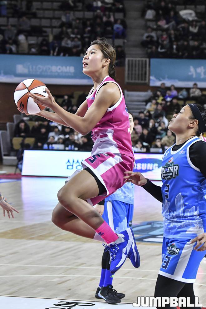 [점프볼=부산/홍기웅 기자] 12일 부산스포원파크BNK센터에서 하나원큐 2019-2020 여자프로농구 올스타전이 열렸다. 핑크스타 박지현이 더블클러치로 득점을 성공시키고 있다.
