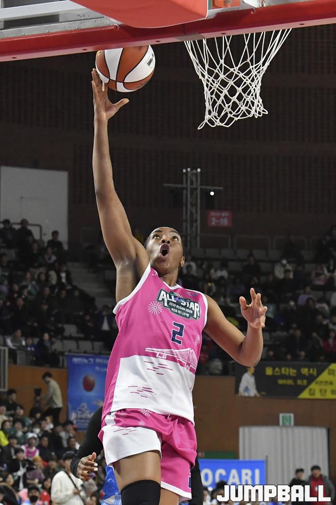 [점프볼=부산/홍기웅 기자] 12일 부산스포원파크BNK센터에서 하나원큐 2019-2020 여자프로농구 올스타전이 열렸다. 핑크스타 쏜튼이 레이업을 시도하고 있다.